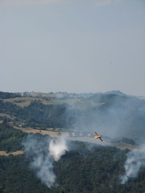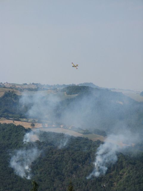 Alle 18 i canadair volavano bassi, l’elicottero de pompieri caricava acqua dalla diga e la gettava sui focolai ma il vento forte non aiutava.