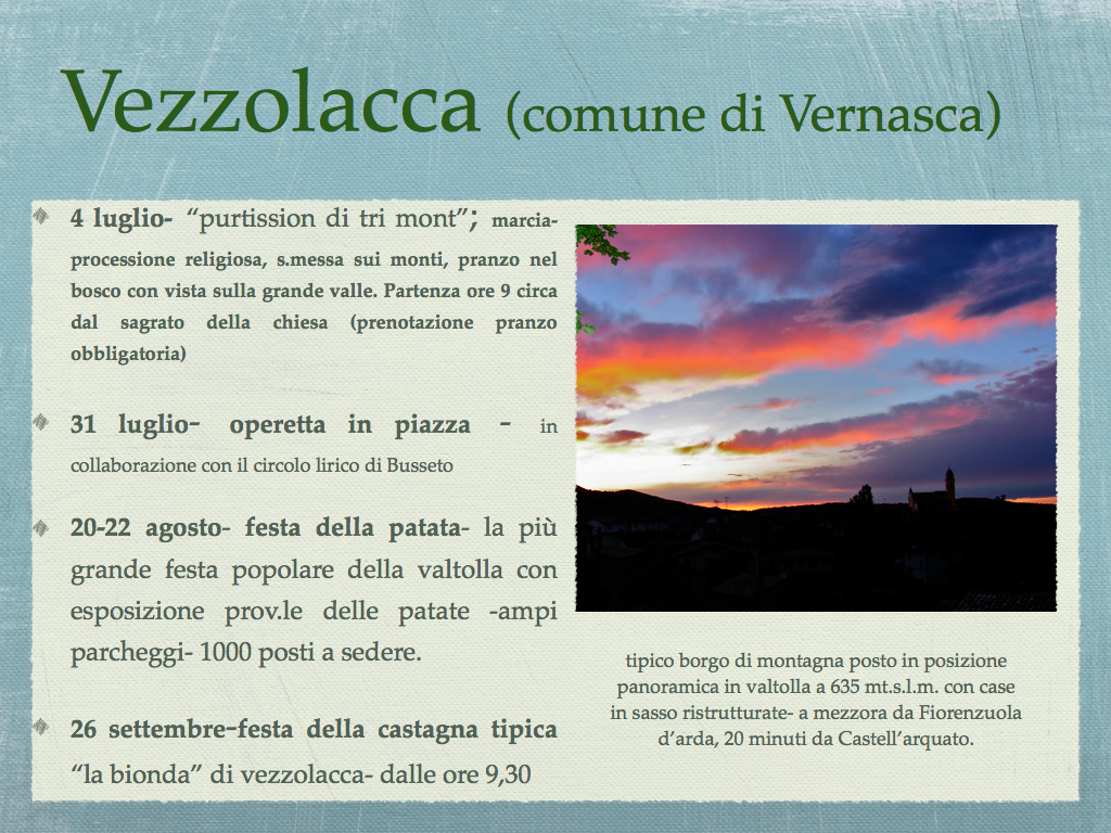 Vezzolacca considerata una delle frazioni più belle di Vernasca, uno dei borghi antichi della valtolla meglio conservati con il suo originario impianto abitativo risalente al medievo, con alcune case antiche ristrutturate mirabilmente da mastri edili eccellenti, con sassi splendidi di cave locali, fino al primo dopoguerra ritenuto il borgo più importante della provincia per la produzione di frutta.
