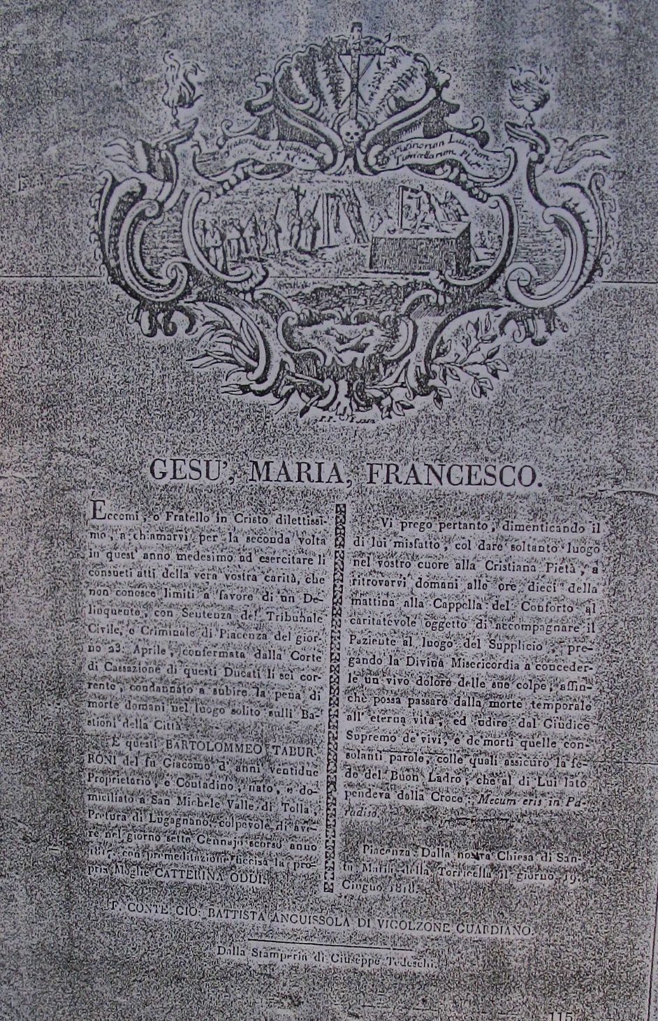 Nell’atto che la confraternita medesima ha stilato, a cura del conte Giovanni Battista Anguissola, guardiano della medesima, sta scritto una supplica al Signore ” ..a ritrovarvi domani alle ore 10 della mattina alla cappella dei conforto al caritatevole oggetto di accompagnare il Paziente al luogo del Supplicio….”.