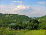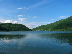 In fondo dall’acqua verde/blu scuro emergono i muri della natura, verdi, armonici….che contrastano il cielo azzurro che si prepara alla sera.