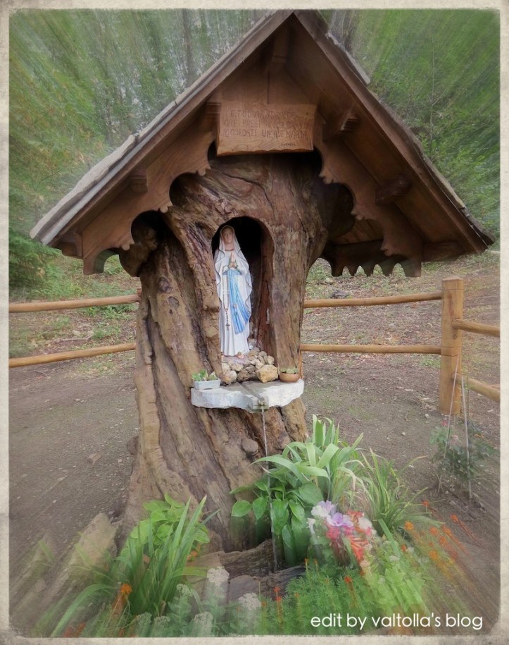 In un vecchio tronco di un castagno secolare Nando e alcuni amici hanno dapprima realizzato questa cappelletta e poi, quest’anno, l’hanno arricchita con un bel “serraglio sonoro” e con un altare sul quale è stato scolpito (da Nando) il Cristo in croce. Sono state anche realizzate le panche per la celebrazione religiosa annuale…