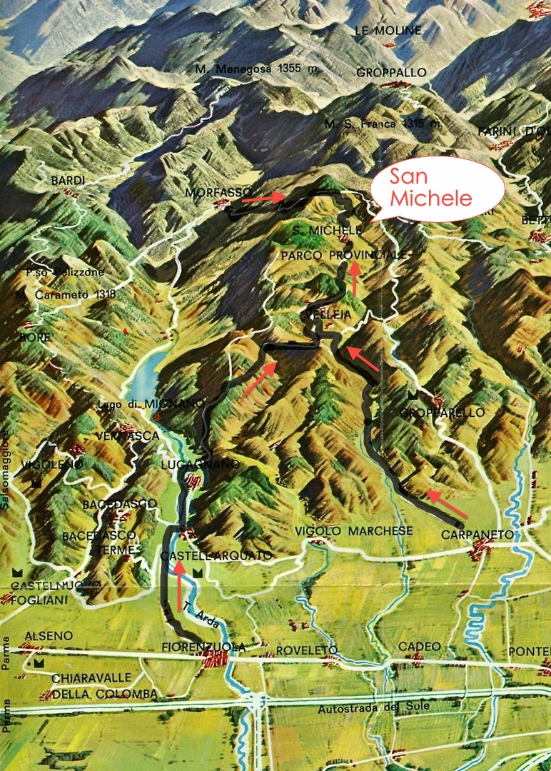San Michele, 680 mt., si trova nel comune di Morfasso, in alta valchero, e dista circa 45 km da Piacenza, 25 km da Carpaneto P.no, 11,5 Km da Morfasso e soli pochissimi km dal rifugio del parco provinciale del monte Moria. La strada più agevole per raggiungere questo bel borgo montanaro è la provinciale che da Carpaneto P.no sale a Badagnano, a Veleia e infine raggiunge San Michele (poi la provinciale prosegue per passo dei Guselli e Parto Barbieri…). Praticamente il paese è posto sotto al monte Cornetto (gruppo del monte Moria) e poco distante dagli spettacolari panorami del Santa Franca e dintorni a cavaliere con la Valnure. Paese ospitale con buona ristorazione, agriturismi, negozi alimentari e bar. Storicamente un territorio della valtolla. Una proloco attivissima, con buona volontà, con tanti giovani…(organizzano manifestazioni estive, autunnali, il presepe vivente, ecc…).