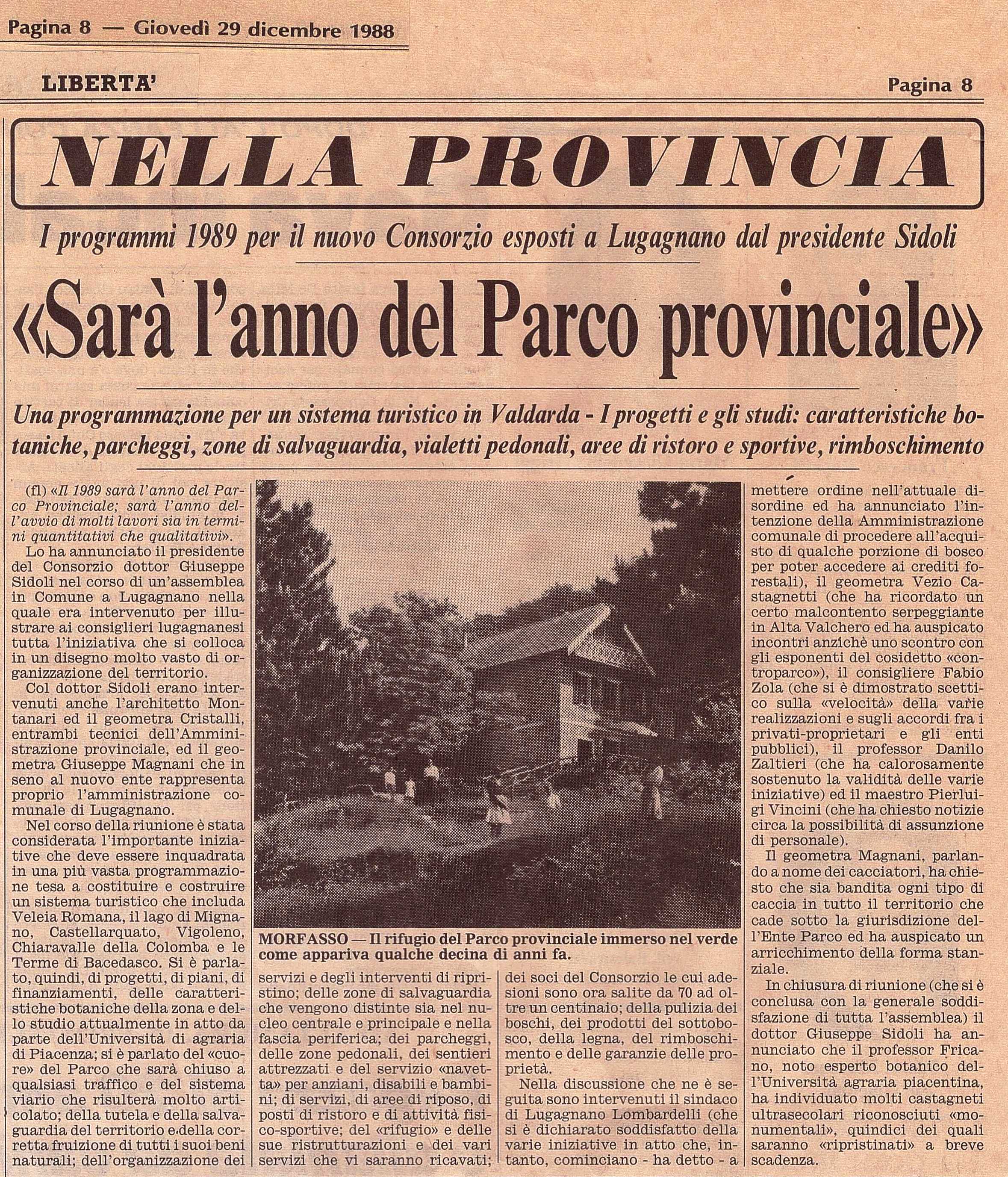 Ci è stata recentemente recapitata da un amico questo estratto del quotidiano “libertà” del 22 dicembre 1988 che in un grande articolo recitava “sarà l’anno del Parco provinciale”.
