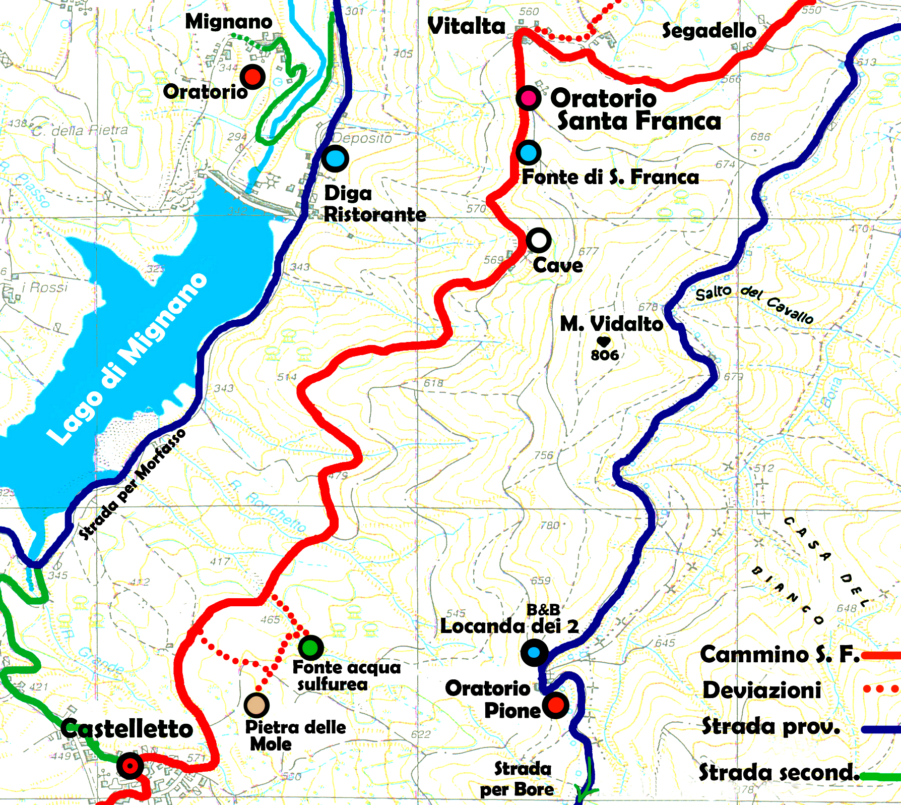 Con modestissimi contributi privati e istituzionali, modesti ma preziosi, sono state realizzate bacheche informative di carattere turistico apposte lungo i diversi cammini dedicati alla Santa e con tanta buona volontà e lavoro volontario pulito sentieri, realizzati e apposti segnavia di legno (sullo stile di quelli del CAI) e le stesse bacheche in talune significative località che meritavano di essere ricordate come la pietra delle mole e la fontana dell’acqua puzza nel tratto tra Vitalta e Castelletto che in tal modo sono finalmente fruibili alla vista di quanti lo desiderassero.
