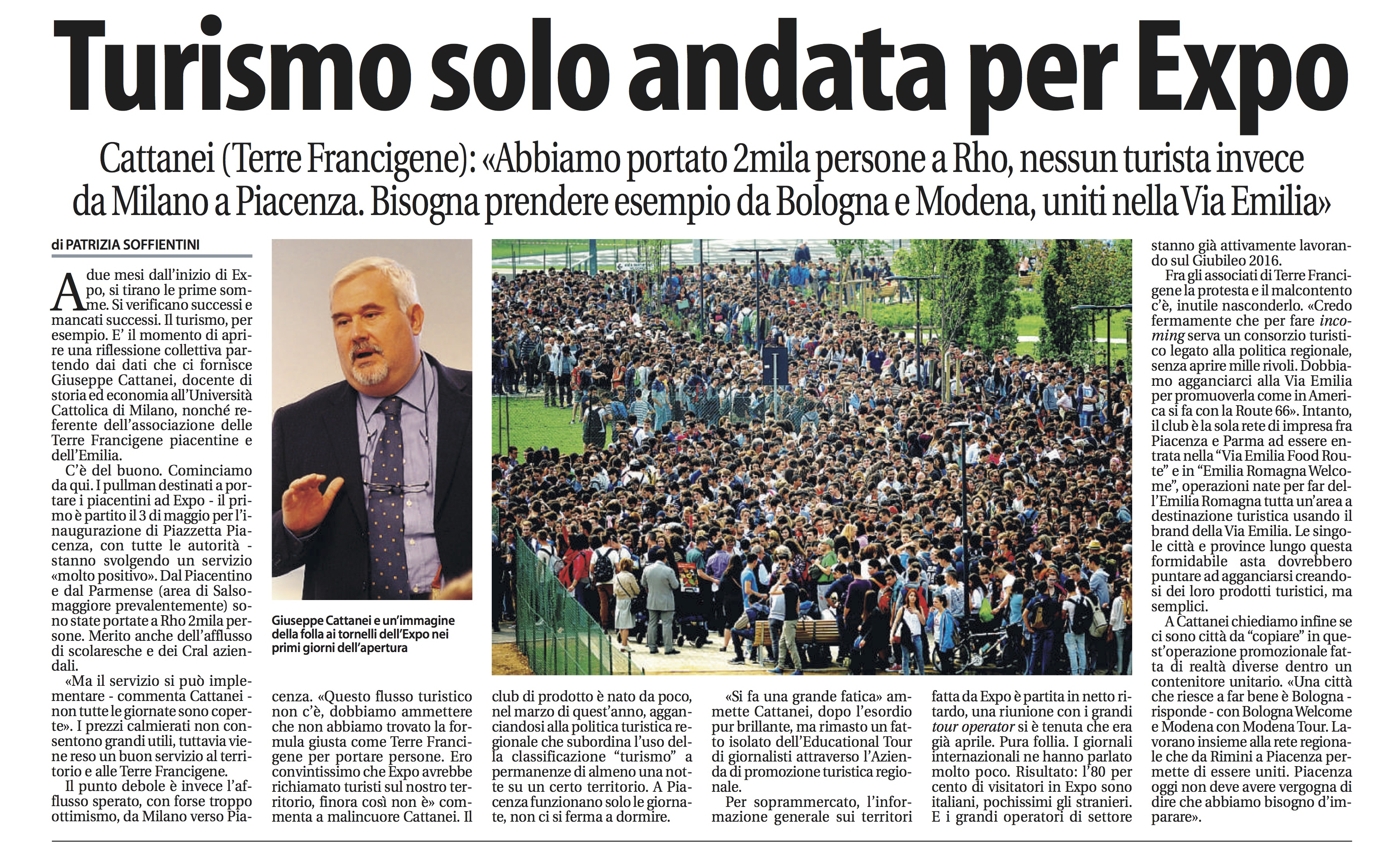 Nei giorni scorsi il quotidiano libertà pubblicava un lungo articolo di P.Soffientini dal titolo “Turismo solo andata per expo” dove venivano riportate le ammissioni di parziale fallimento del progetto che prevedeva di portare un buon numero di turisti expo nella nostra provincia. Il referente del club di prodotto”terre francigene piacentine“, la speciale associazione di scopo fondata da confcommercio, coldiretti, confartigianato piacentini e altri soci che gestisce i flussi da e per l’expo di Milano ammette che qualcosa non va.