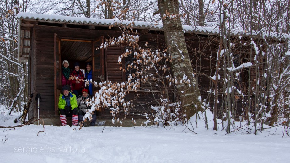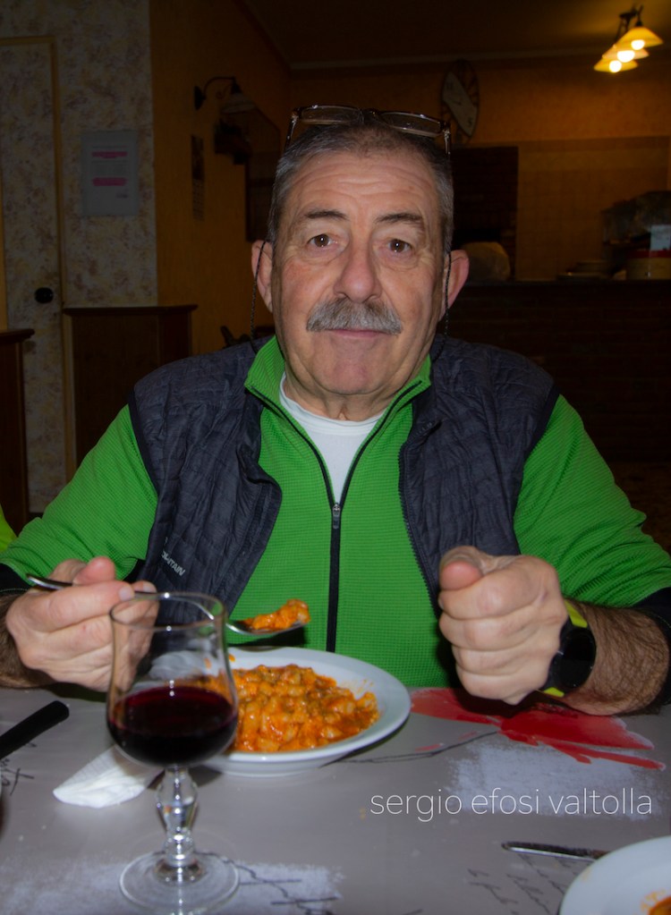 Allora sosta, breve, per sorseggiar un caffè caldo, scattar ancora qualche foto e avviarci al ritorno lento, con passi brevi, contemplando la neve prima del pranzo da Marisa & family a Ca’ del Bosco a base di pisarei e fasö, accompagnati da Gutturnio frizzante di Travazzano.