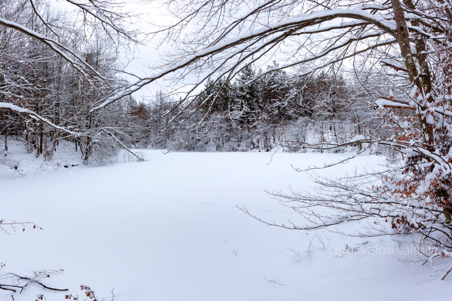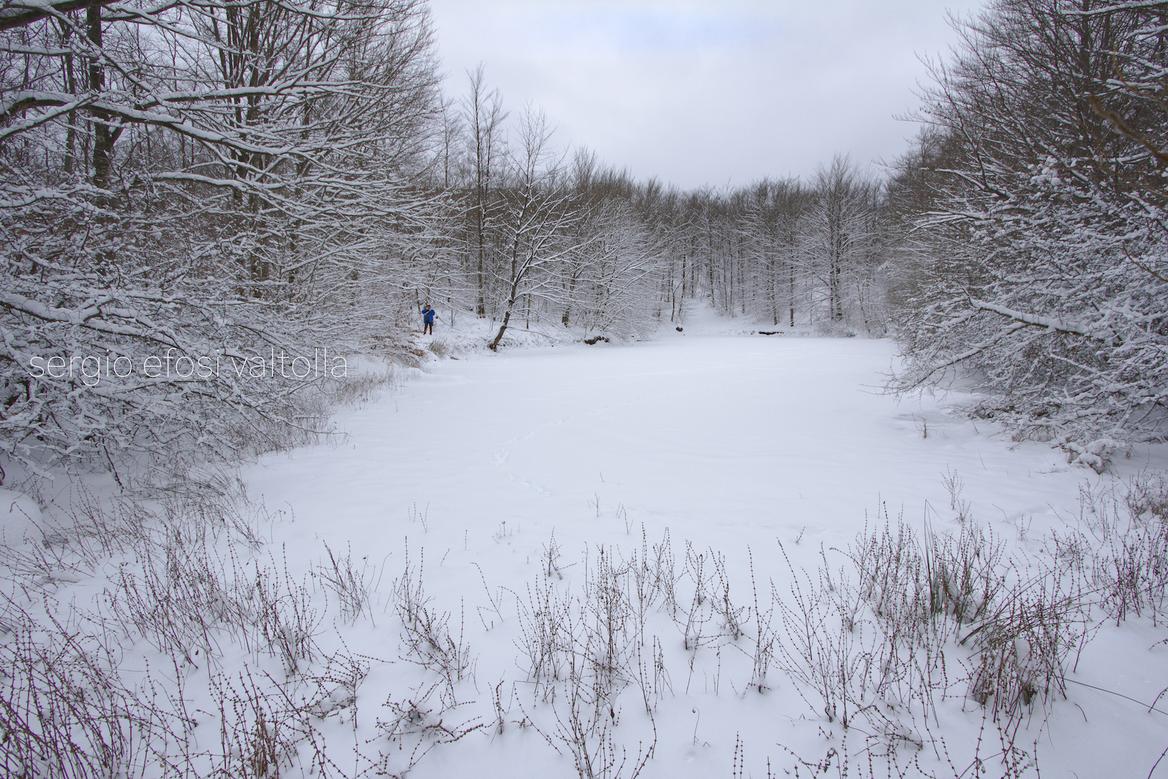 Il silenzio della natura era solo interrotto dal richiamo lieve della fauna volatile e dallo scorrere dei ruscelli non ancora ghiacciati. Avanzavamo tra rami carichi di neve, orme di caprioli e cinghiali mentre quella quiete ci coinvolgeva sempre più.