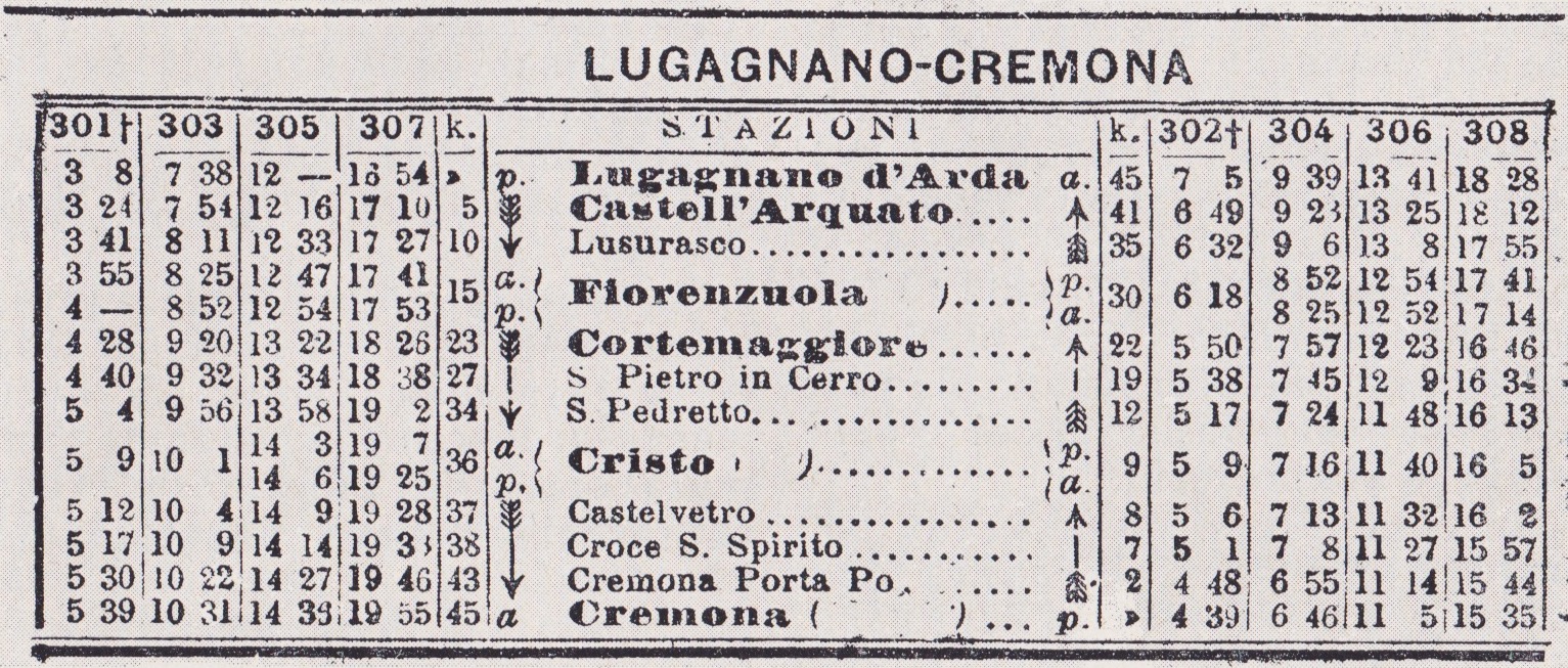 Partenze da Lugagnano alle ore tre e zero otto (3.08) e arrivo a Cremona alle ore 5.39. Le altre partenze da Lugagnano alle ore 7.38, 12.00 e 16.54.