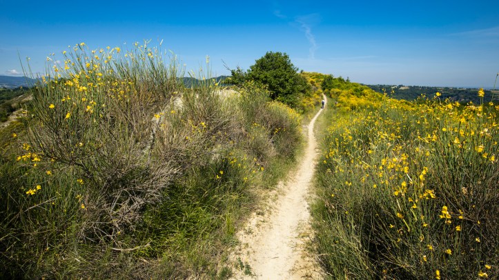 Vista dall’alto dell’inizio del tratto del sentiero della Ciocca di Castell’Arquato, segnalato in questo articolo.Particolare e bello lo scenario che si gode camminando a “La Ciocca”, nella stagione primaverile con le ginestre in fiore. Luoghi protetti della “Riserva del Piacenziano” dove furono recuperati numerosi reperti scheletrici di una balenottera custodita nel pregiato museo geologico “Cortesi” (link)di Castell’Arquato…