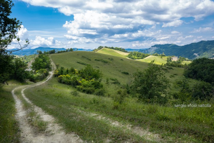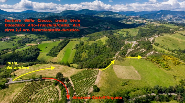 Il tratto percorso, per me il più bello (e pure facile), parte tra la strada che conduce a Bacedasco Alto e il bivio per Franchini (il botteghino). Da questo punto, a destra provenendo da Castell’Arquato, si snoda sul filo di costa alto collinare, tra Val d’Arda e Val d’Ongina, un bel sentiero interamente segnato dal CAI, uno dei più belli della collina di Piacenza, tra panorami e ginestre fino a raggiungere la località “case sparse Rizzolino (Costa)”. Andata e ritorno circa 2/2,5 ore.