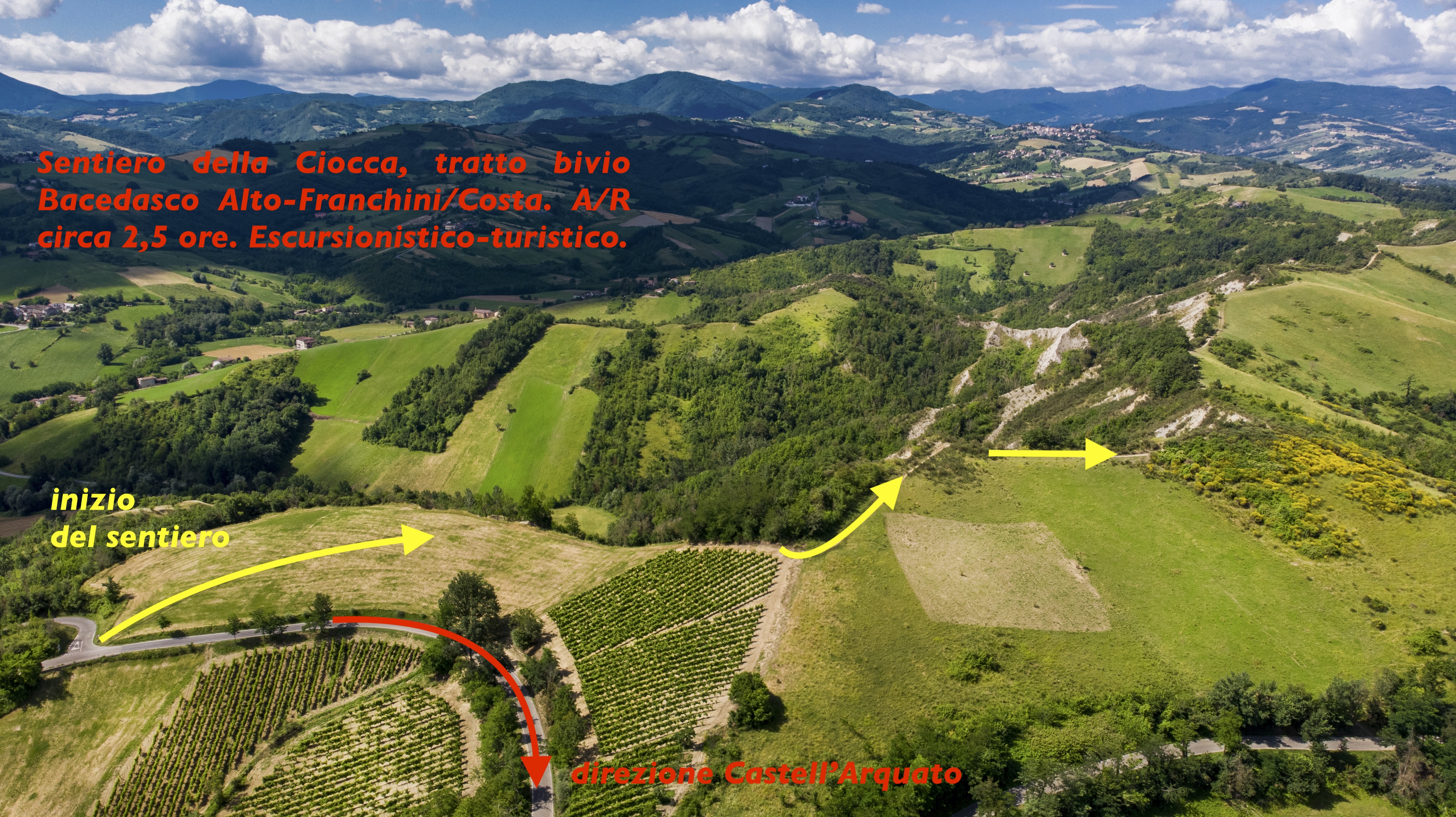 Il tratto percorso, per me il più bello (e pure facile), parte tra la strada che conduce a Bacedasco Alto e il bivio per Franchini (il botteghino). Da questo punto, a destra provenendo da Castell’Arquato, si snoda sul filo di costa alto collinare, tra Val d’Arda e Val d’Ongina, un bel sentiero interamente segnato dal CAI, uno dei più belli della collina di Piacenza, tra panorami e ginestre fino a raggiungere la località “case sparse Rizzolino (Costa)”. Andata e ritorno circa 2/2,5 ore.
